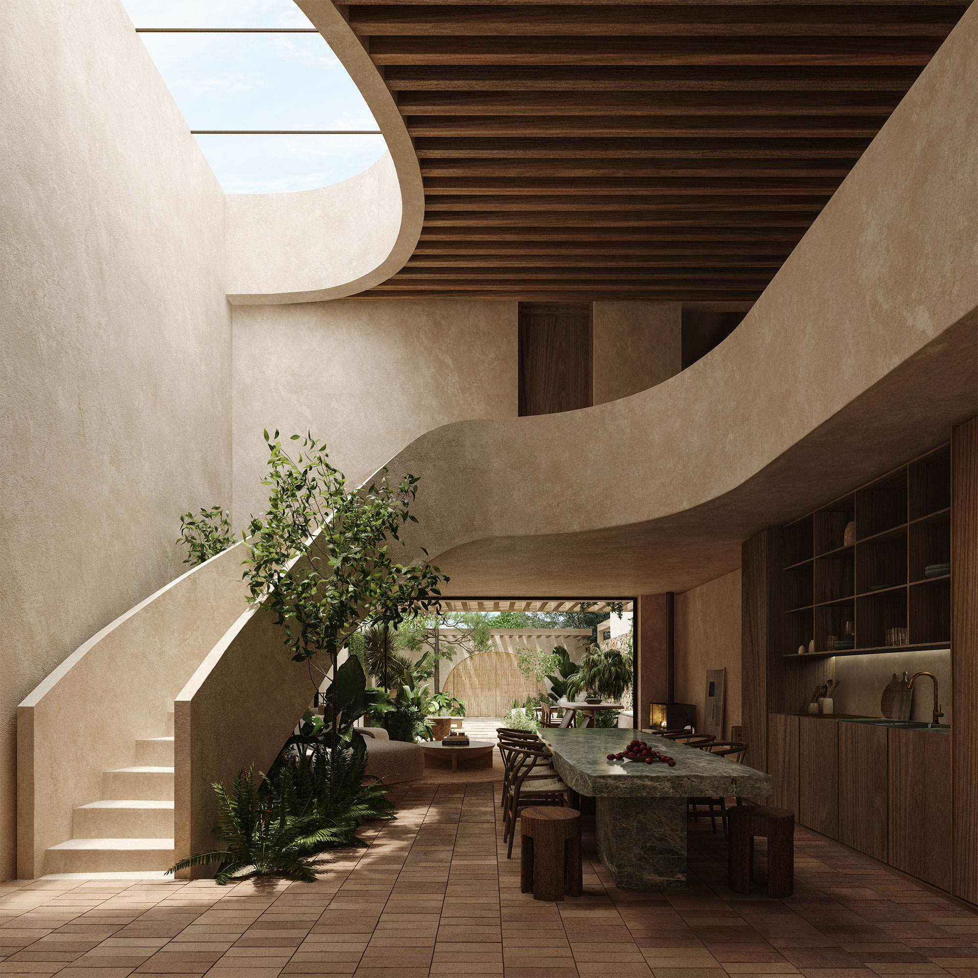 The main interior patio features soaring double-height ceilings, bathing the space in natural light and promoting cross-ventilation, which reduces thereliance on artificial climate control.